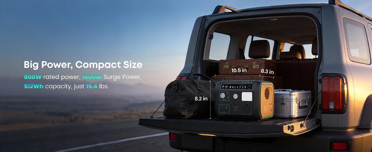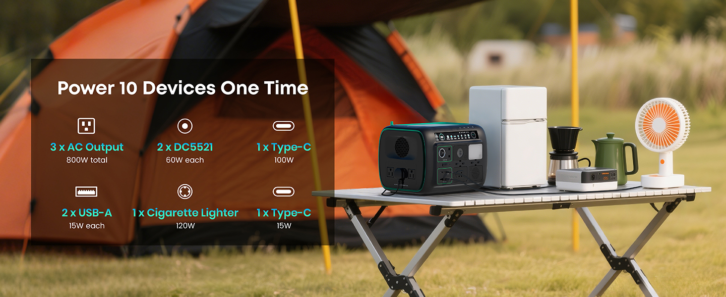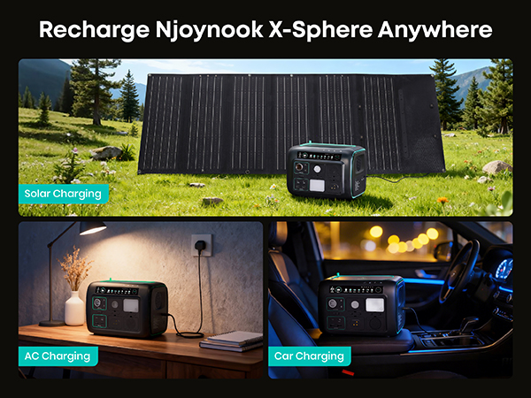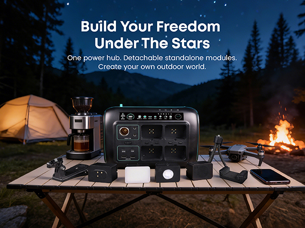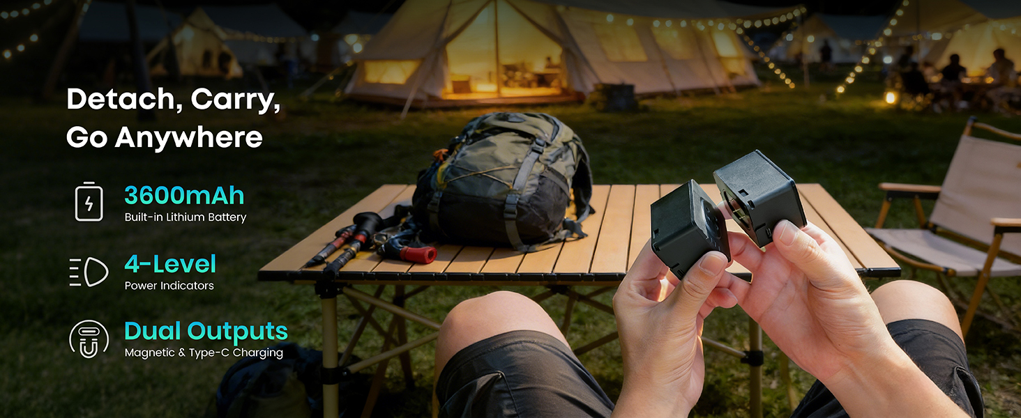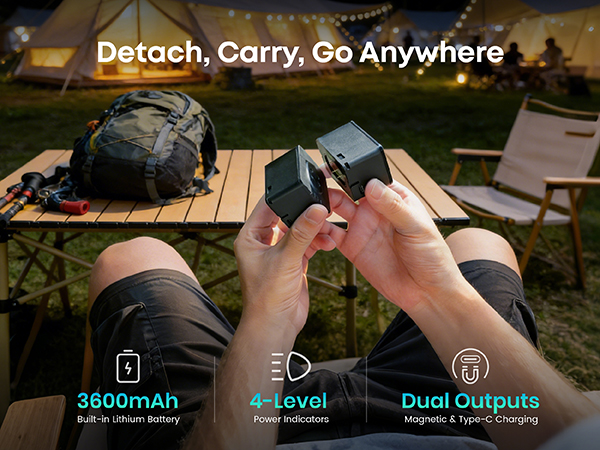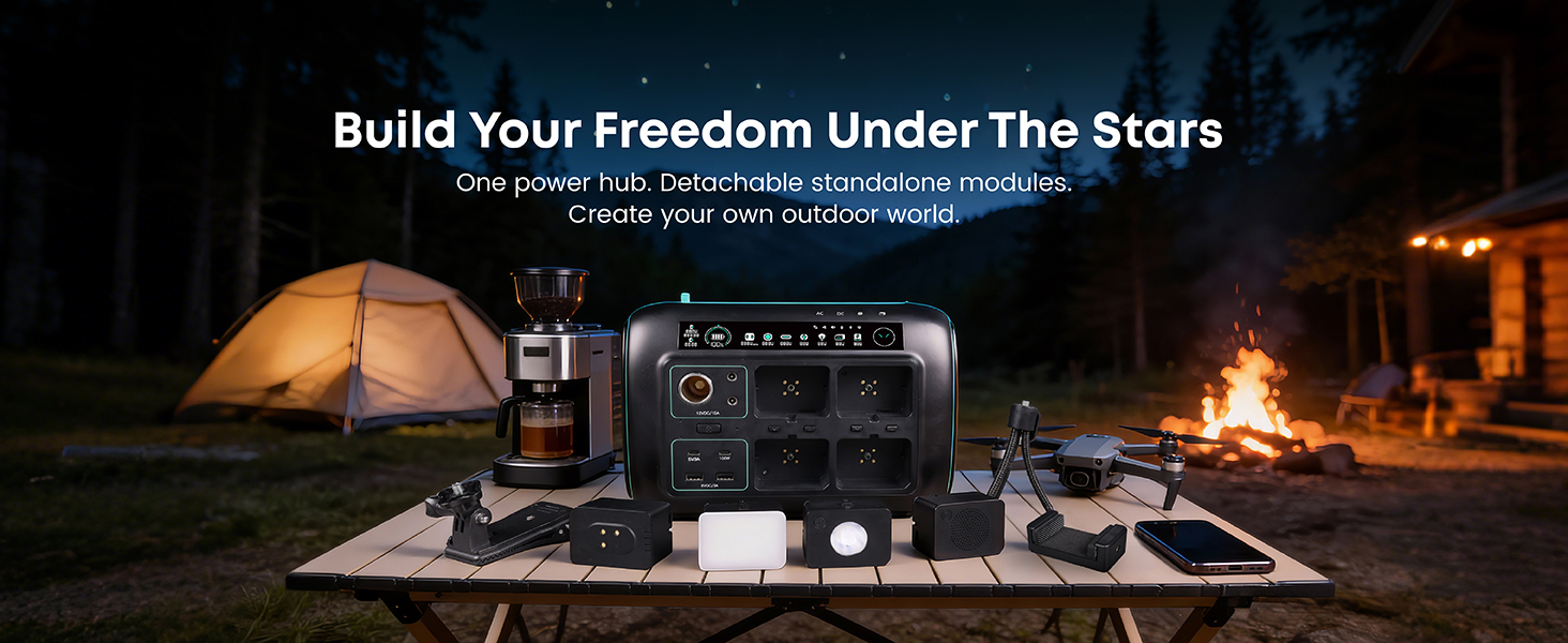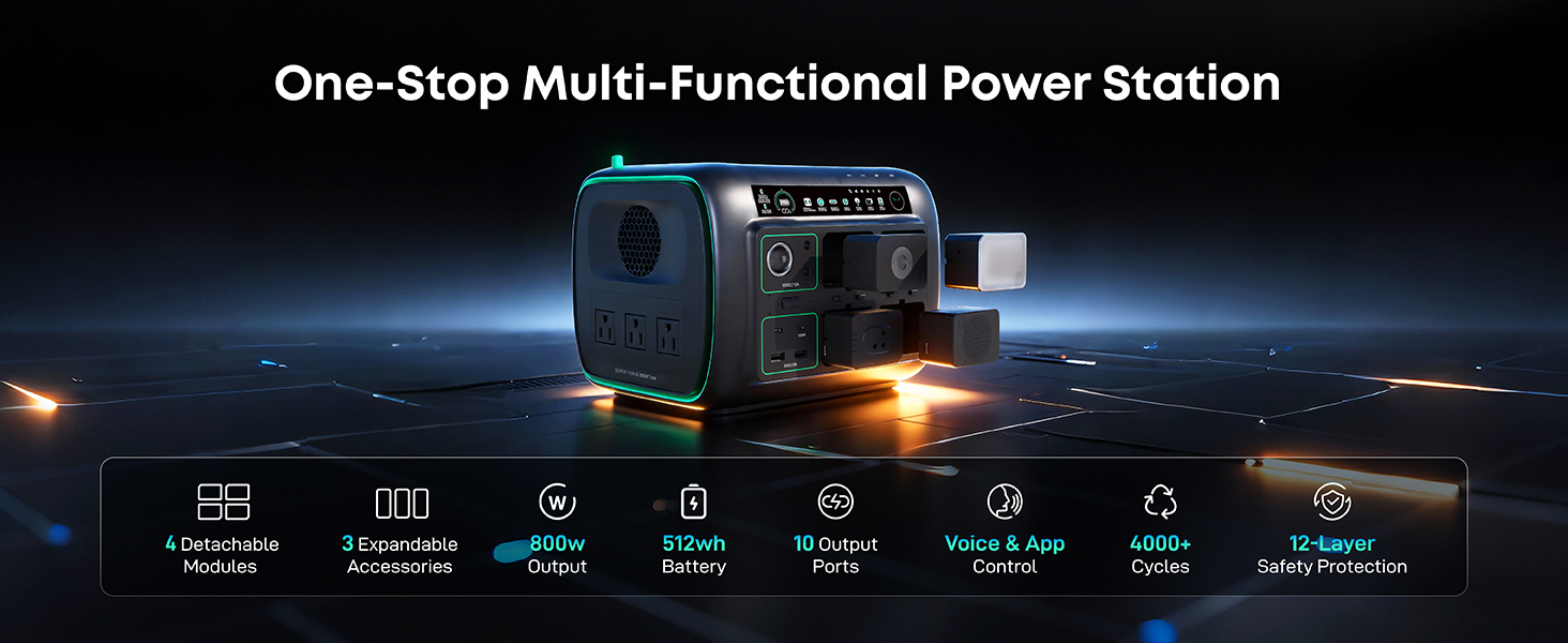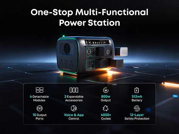 [5-in-1 Modular Power Station] 512Wh / 800W portable power station with 4 detachable modules: Spot Light, Panel Light, Speaker, and Power Bank. Use each module independently or combine them to build your own camping & outdoor setup. [Voice + App Smart Control] Control power and lights with voice commands or the mobile app—hands-free, convenient, and perfect for camping, RV trips, and everyday use. [800W Rated, 1600W Surge | 10 Outputs] The power station runs up to 800W continuously and supports 1600W surge. Includes 3 AC outlets, 2 DC5521, 2 USB-A, 2 USB-C, and a car socket—ideal for outages, travel, and home backup. [4,000+ Charge Cycles & 10 Years Lifespan] With advanced LiFePO4 cells, the Njoynook power station supports up to 4,000 charge cycles and features multi-layer safety protection for dependable power year after year. [3 Mounting Accessories for Versatile Use] The solar generator includes a magnetic holder, tripod, and backpack clip. Mix and match these accessories to power your outdoor life.