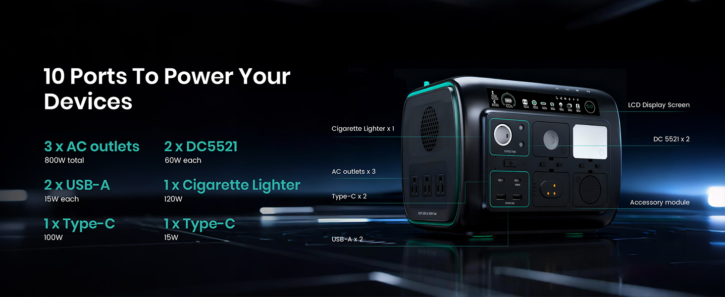 [10 output Ports] 1× car cigarette lighter, 2× USB-C , 2× USB-A, 3× AC, and 2× DC, it caters to a wide range of devices.