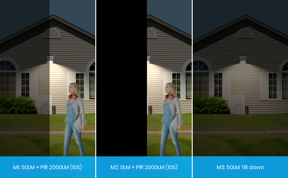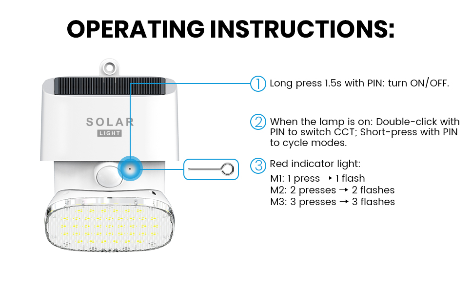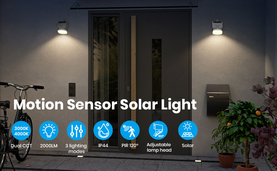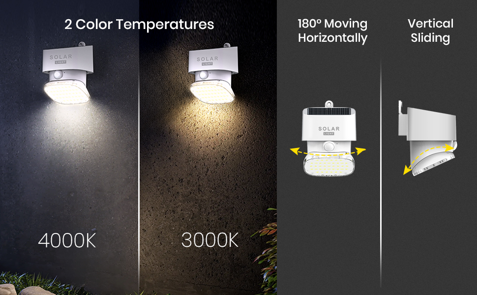 [Dual Color Temperature] With 2000 high lumens brightness, small solar light can be switch between cool white (4000K) and warm white (3000K) to suit different moods and outdoor lighting needs. [3 Working Modes] Solar motion sensor light has different lighting modes, M1: Dim-to-Bright modes, M2: Motion-Activated, or M3: Always On. Weather-resistant design withstands rain and dust for long-lasting use. [Adjustable & Flexible Design] The head of solar powered outdoor light can be 180° horizontally rotatable, or vertical sliding for precise lighting direction control. [Solar Lamp Operating Instructions( Found on the box)] T1. Long press 1.5s with PIN: turn ON/OFF. 2. When the lamp is on: Double-click with PIN to switch CCT; Short-press with PIN to cycle modes. 3. Red indicator light: M1: 1 press → 1 flash, M2: 2 presses → 2 flashes, M3: 3 presses → 3 flashes [Easy Installation & Solar-Powered] Installation is quick and no wiring needed! The solar fence light charges by day and lights up automatically at night, enjoy efficient, long-lasting illumination with no electricity bills!